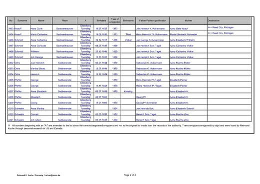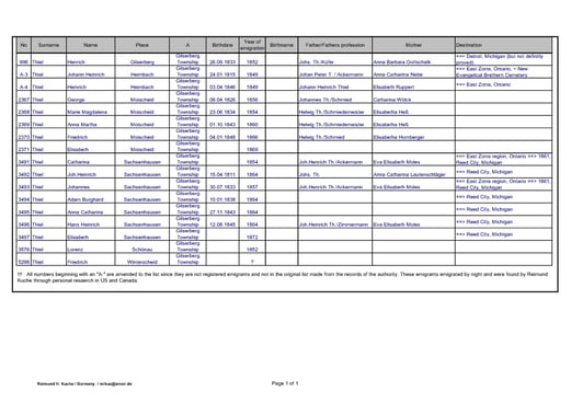 That resulted in emigration of Thiel descendants, relatives to each other, from Sachsenhausen, Heimbach, Gilserberg and Moischeid to Ontario and in a second step (or later directly) from there to Michigan (Osceola County) in the first immigrant generation.