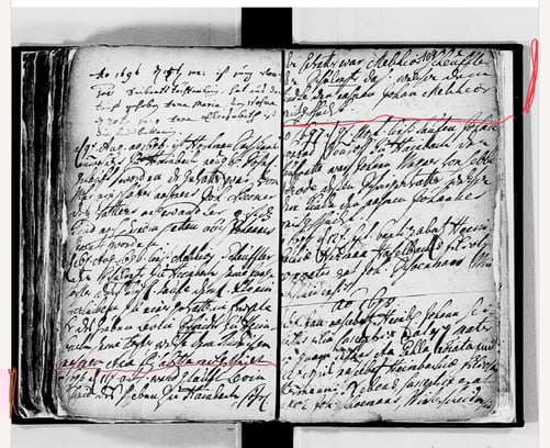 A picture from the eldest church records of Heimbach (beginning 1689) with the entry of the birth of one of Levin Schmidt sons in 1696. That is the one to which my ancestral (and also those of the above mentioned Schmidt) line goes directly.