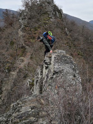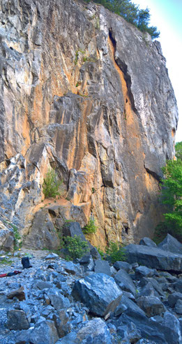 Zwei Wochen später waren wir schon um 04:30 losgefahren, um die kühlen Morgentemperaturen nutzen zu können und der aufgeheizten Wand in der Mittagssonne zu entgehen. Zum Abschluss des Training beendeten wir die Route Nr. 12 "Via Segantini", eine 5+ mit einer langen 35 m Abseilstrecke gegen 11:30 h und waren froh, so früh aufgebrochen zu sein, da die hochstehende Sonne nun auf die Wand strahlte und die Lufttemperatur bereits bei ca. 28 Grad lag. Ab nach Hause zum Mittagessen und danach in den Schatten auf die Terrasse, Tagwerk bereits erledigt ;-)